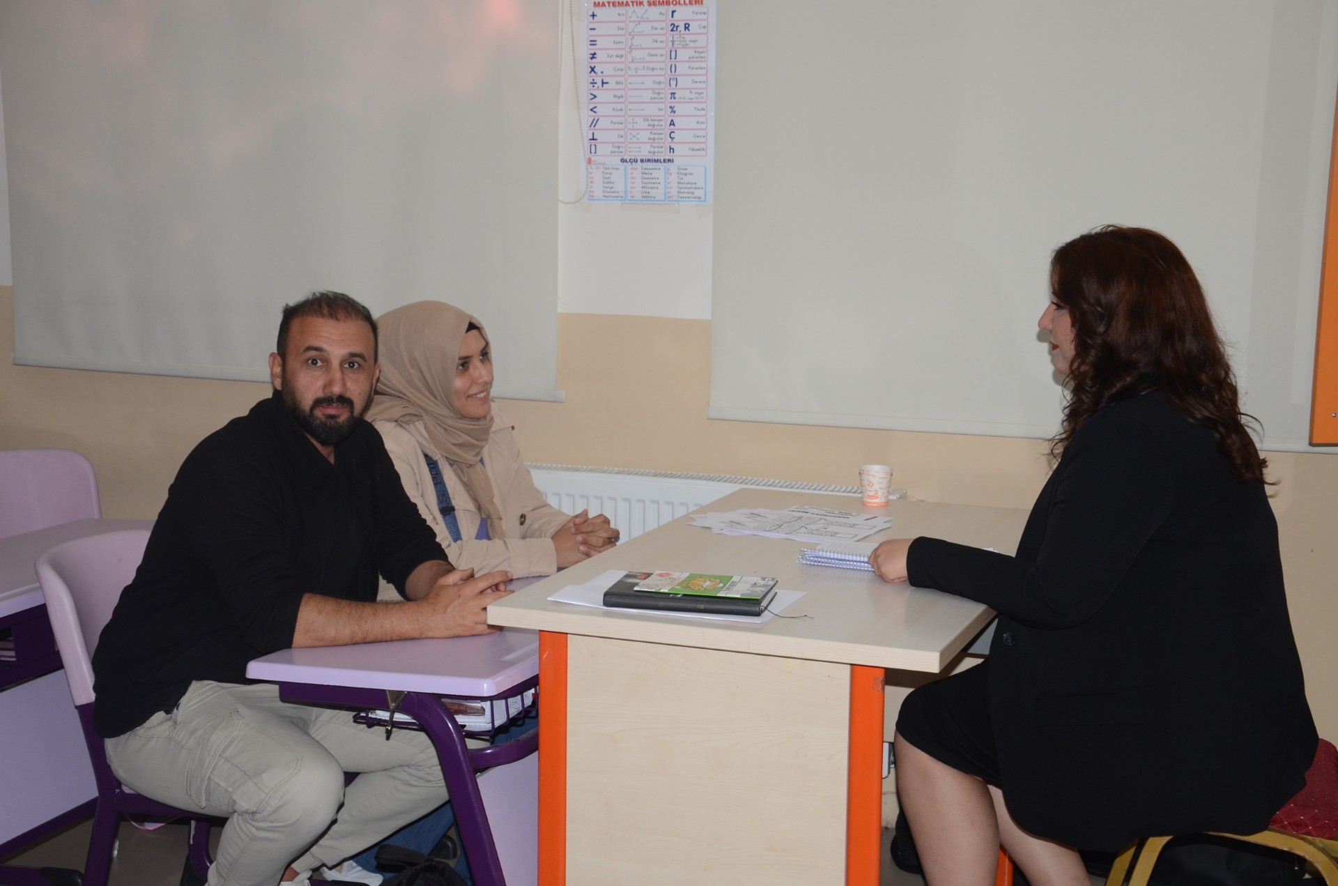 Özel Kardelen İlköğretim Okulu binasında velilerle birebir ilgilenen öğretmenler, öğrencilerin durumu ve ders programları hakkında aileleri bilgilendirdi.