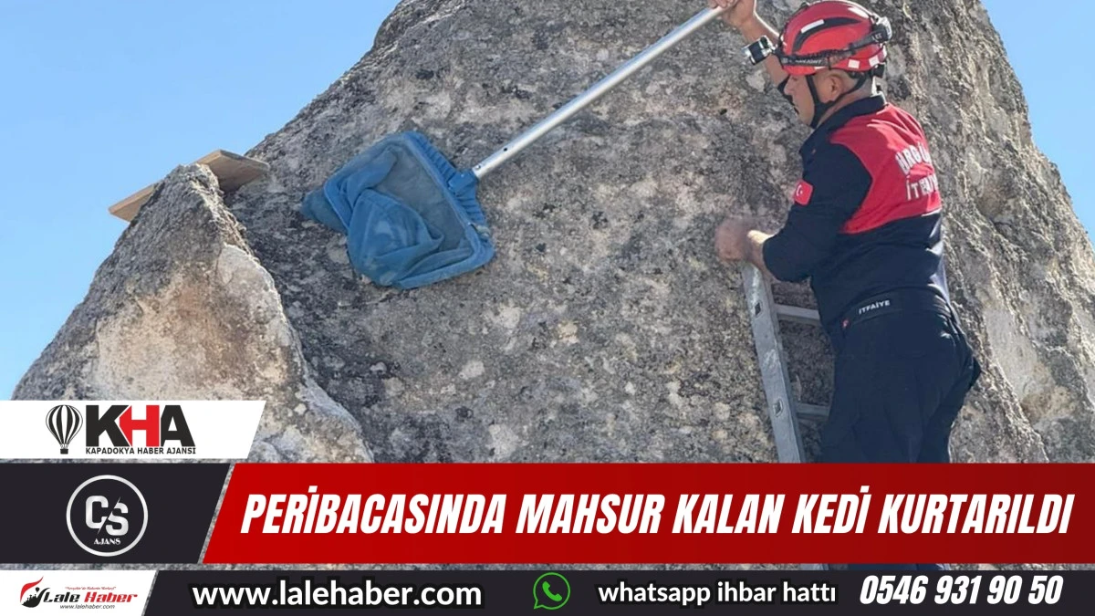 Nevşehir’in merkez ilçeye bağlı Göreme beldesinde bir peribacasında mahsur kalan kedi, Ürgüp Belediyesi İtfaiye ekiplerinde mahsur kaldığı yerden kurtarıldı.