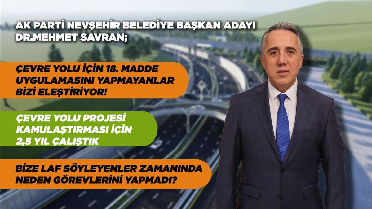 AK Parti Belediye Başkan Adayı Dr. Mehmet Savran, “Keşke Çevre Yolu Projesi için bugün bizi eleştirenler görev sürelerinde 18. Madde uygulamasını yapsalardı da biz bugün çevre yolunun inşaatını konuşuyor olacaktık.” dedi.