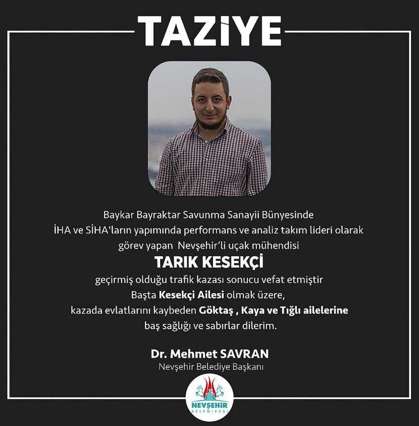 Nevşehir Belediye Başkanı Dr. Mehmet Savran, geçirdiği trafik kazasında hayatını kaybeden Nevşehirli genç uçak mühendisi Tarık Kesekçi için taziye mesajı yayımladı.