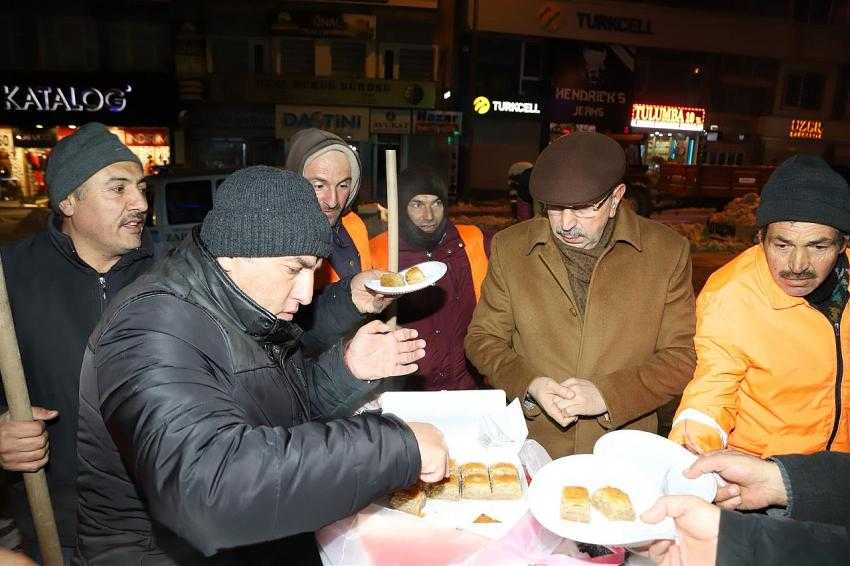 Atatürk Bulvarı üzerindeki kar temizliği çalışmaları yapan belediye personelini tebrik eden Başkan Seçen daha sonra işçilere baklava ikramında bulundu.
