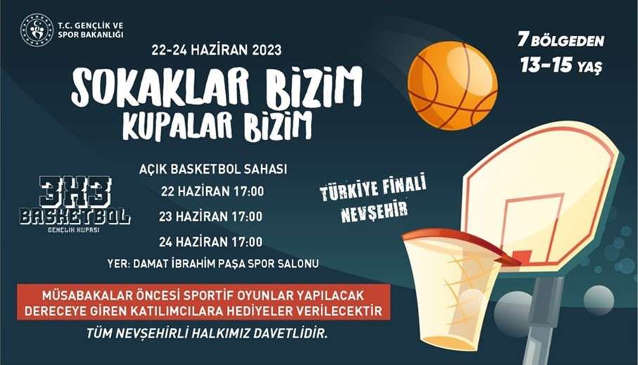 NEVŞEHİR(MHA) Gençlik ve Spor Bakanlığının sporu toplumun her kesimine yaymak, gençler arasındaki iletişimi güçlendirmek, spor yapma alışkanlığı kazandırmak ve spor yolu ile sosyalleşmelerini sağlamak, beden-ruh sağlıklarını geliştirmek, daha fazla müsabakanın yapılması, kulüplere ve milli takımlara alt yapı oluşturulması, yetenek taraması ve spora yönlendirme projesinin desteklenmesi vb. Amacıyla “Sokaklar Bizim Kupalar Bizim 3x3 Basketbol Gençlik Kupası” Türkiye Şampiyonası Nevşehir’de düzenlenecek.