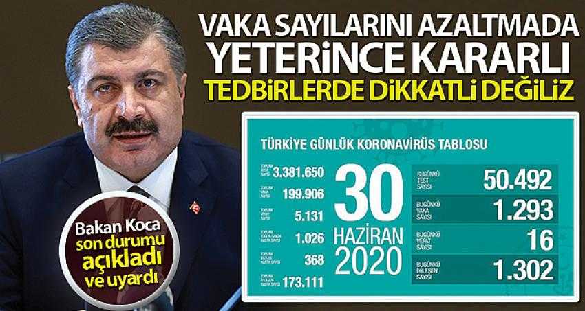 Sağlık Bakanı Fahrettin Koca, Twitter'dan yaptığı paylaşımda, “Düne kıyasla entübe hasta sayımızda 7 azalma, yoğun bakım sayımızda 8 artış var. Günlük test sayılarımız yakın. Yeni vaka sayımız dünden 81 az, yeni iyileşen hasta sayısıyla yakın. Vaka sayılarını azaltmada yeterince kararlı, tedbirlerde dikkatli değiliz” dedi.