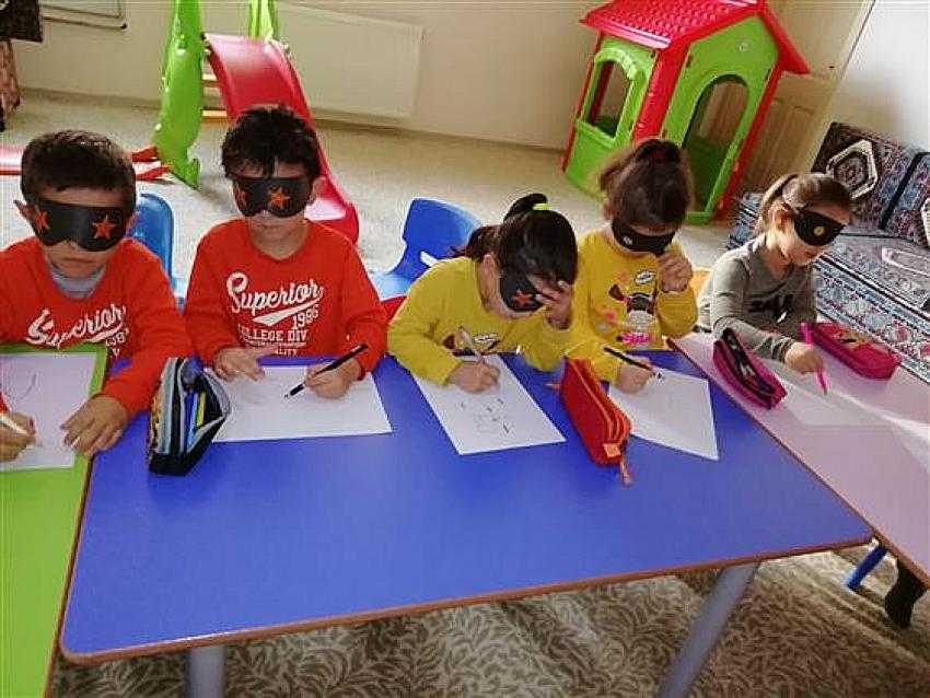 Minik öğrencilerde farkındalık oluşturmak ve özel insanların hayatlarında karşılaştıkları zorluklara dikkat çekmek amacıyla öğrencilerin gözleri, bazılarının elleri ve kolları bağlanarak empati kurarak engelli kardeşlerimizin yaşadıkları sıkıntıları anlamaları sağlandı.