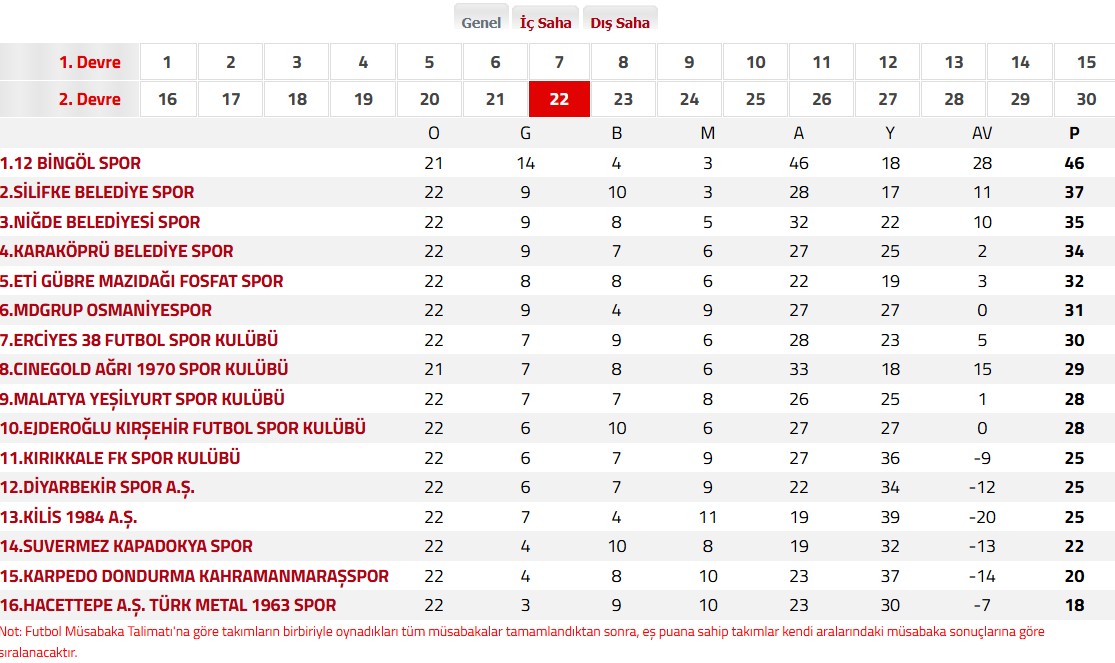 TFF 3.Lig 2.GRupta 22.haftanın sonuçları ve puan durumu