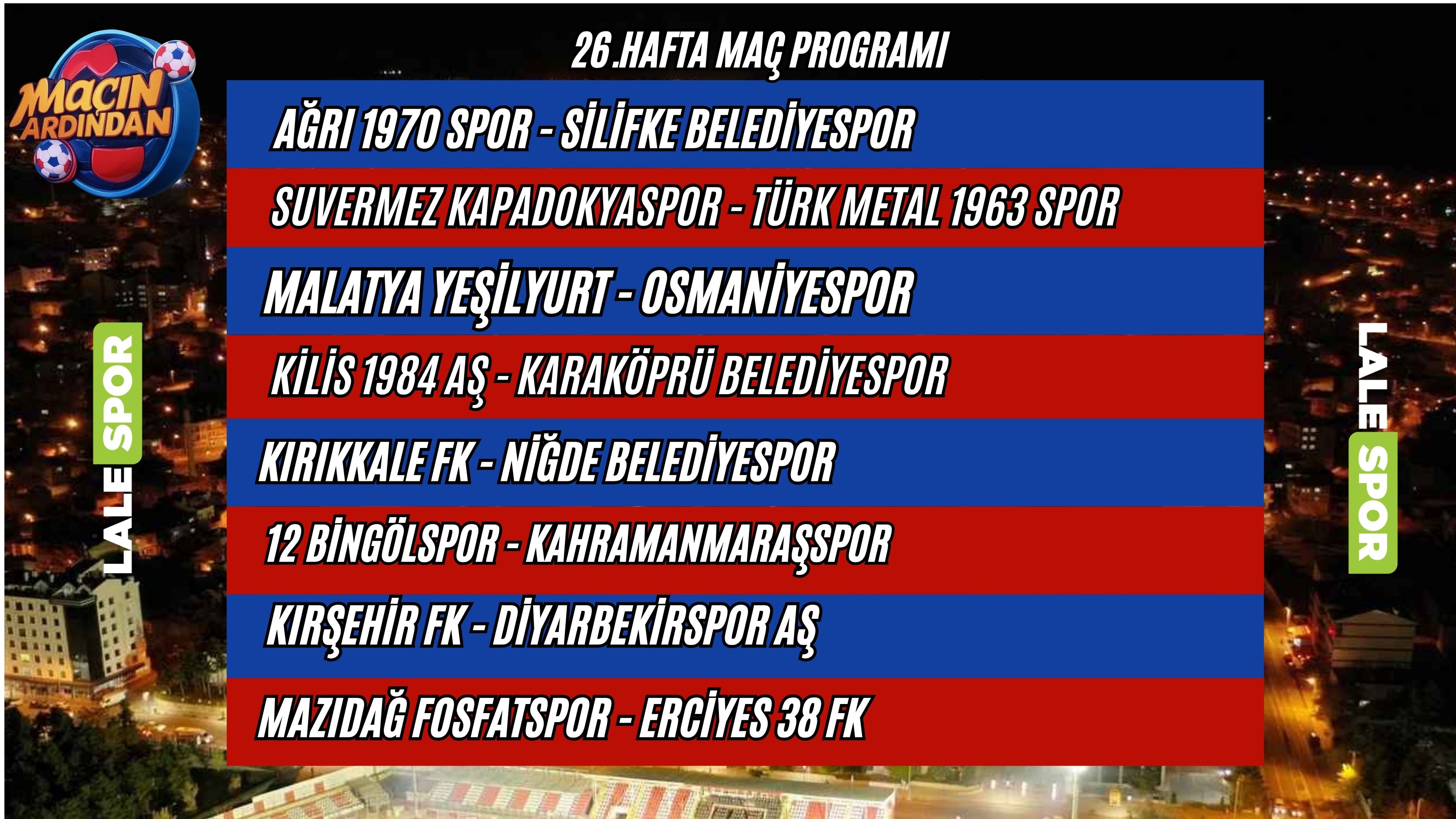 TFF 3.Lig 2.Grupta 26.hafta 24 Mart Salı ve 25 Mart Çarşamba günü oynanacak olan maçlar ile tamamlanacak. 24 Mart Salı günü 4 karşılaşma oynanacakken bu hafta play-off ve düşme hattında alınacak sonuçlar futbolseverleri merakla bekliyor.