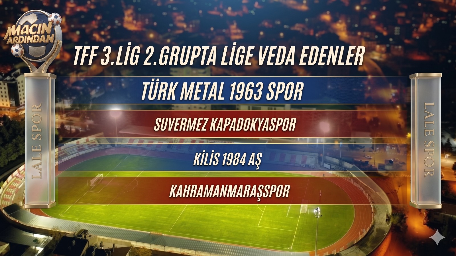 2025-2026 futbol sezonunda 3.Lig 2.Grupta sezonun tamamlanmasının ardından Türk Metal 1963 Spor, Suvermez Kapadokyaspor, Kilis 1984 AŞ. ve Kahramanmaraşspor takımları Bölgesel Amatör Lige düşen takımlar oldu.