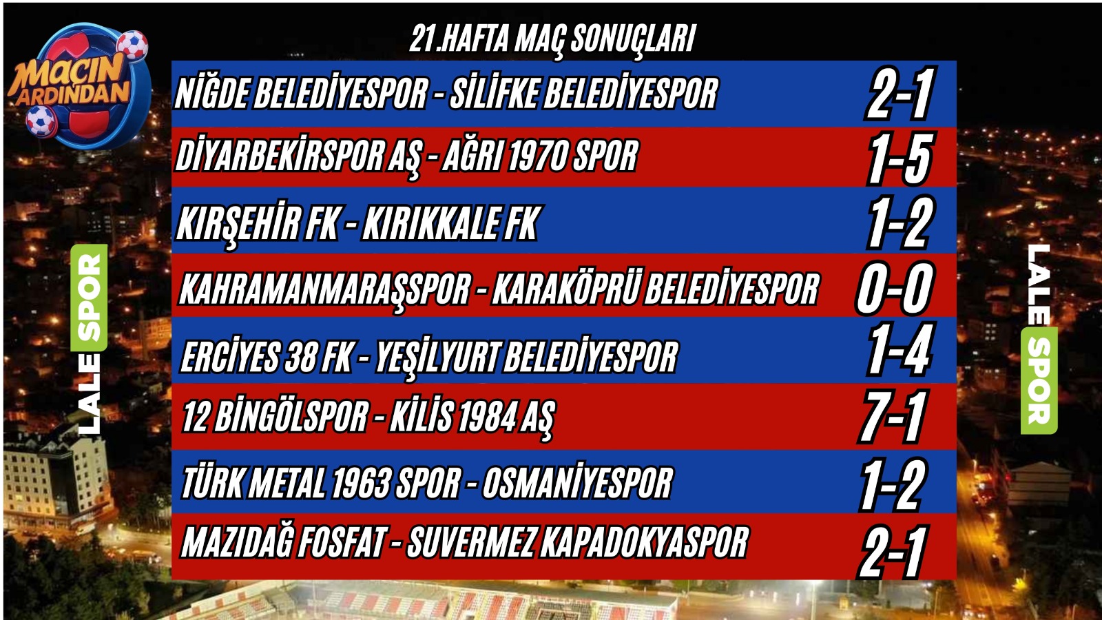 TFF 3.Lig 2.Grupta 21.hafta bugün oynanan 6 karşılaşma ile tamamlandı. Lider 12 Bingölspor kendi saha ve seyircisi önünde Kilis 1984 AŞ’yi 7-1 mağlup ederek haftanın en farklı skorunu elde ederken Malatya Yeşilyurt Belediyespor ise haftanın sürprizi yaparak deplasmanda Erciyes 38 FK’yı 4-1 mağlup etti.