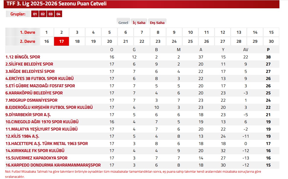 TFF 3.Lig 2.Grupta 17.hafta bugün oynanan maçlar ile tamamlandı.
