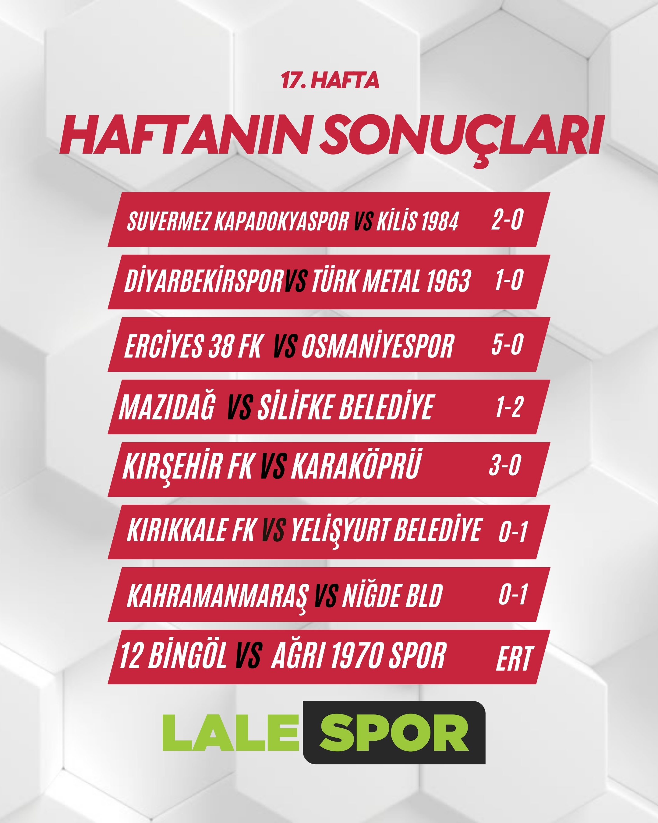 TFF 3.Lig 2.Grupta 17.hafta bugün oynanan karşılaşmalar ile tamamlandı. Lider 12 Bingölspor-Ağrı 1970 Spor karşılaşması hava şartlarından dolayı ileri bir tarihe ertelenirken Suvermez Kapadokyaspor kendi saha ve seyircisi önünde Kilis 1984 AŞ takımını 2-0 mağlup ederek puanını 16’ya çıkarttı.