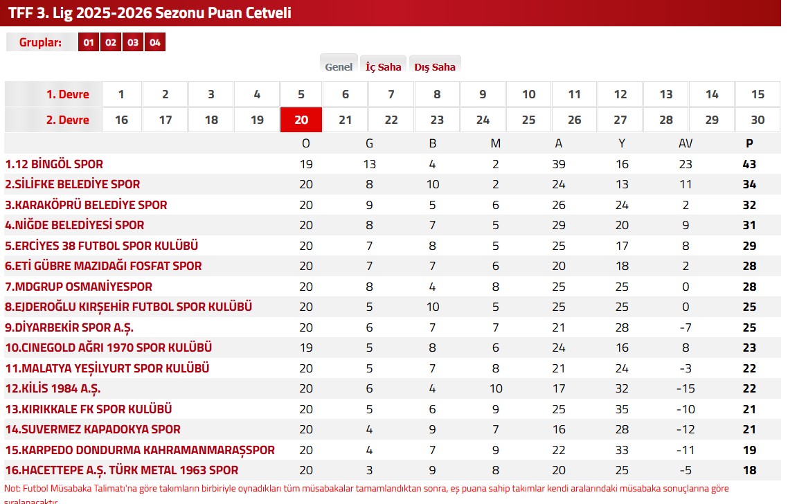 TFF 3.Lig 2.Grupta 20.hafta dün ve bugün oynanan karşılaşmalar ile tamamlandı. Lider 12 Bingölspor deplasmanda konuk olduğu Kırıkkale FK ile 1-1 berabere kalırken Suvermez Kapadokyaspor Kırşehir FK takımını 1-0 mağlup ederek son sıradan 14.sıraya yükseldi.