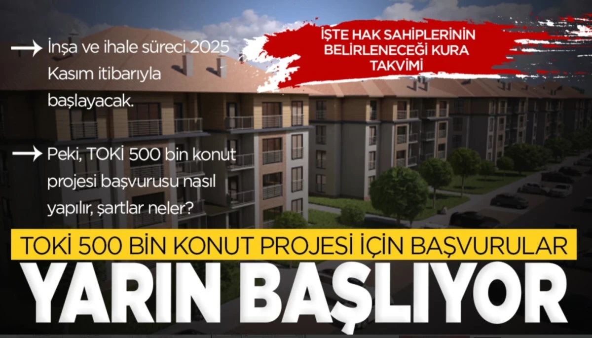 TOKİ 500 bin konut projesi için başvurular 10 Kasım Pazartesi günü başlıyor. Yüzyılın Projesi olarak adlandırılan ve 81 ilde dar gelirli vatandaşlar için uygun koşullarda 500 bin sosyal konutun satışa sunulacağı bu proje için başvurular 10 Kasım-19 Aralık 2025 arasında yapılacak.