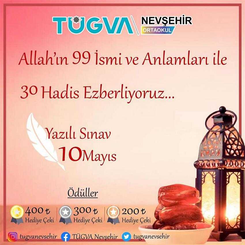 İl Temsilcisi Selçuk Cingitaş, "TÜGVA Nevşehir olarak düzenlemiş olduğumuz; Esma-i Hüsna ve 30 Hadis Ezberleme Yarışmamızın dereceye giren ilk üç öğrencisi Zeynep Şahin, Bilal Şahin, Elif Köylü. Bütün öğrencilerimizi, ailelerimizi, öğretmenlerimizi tebrik ediyor, Ortaokul Koordinatörüm Yunus Emre Öztürk kardeşime ve ekibine de teşekkür ediyorum" dedi.