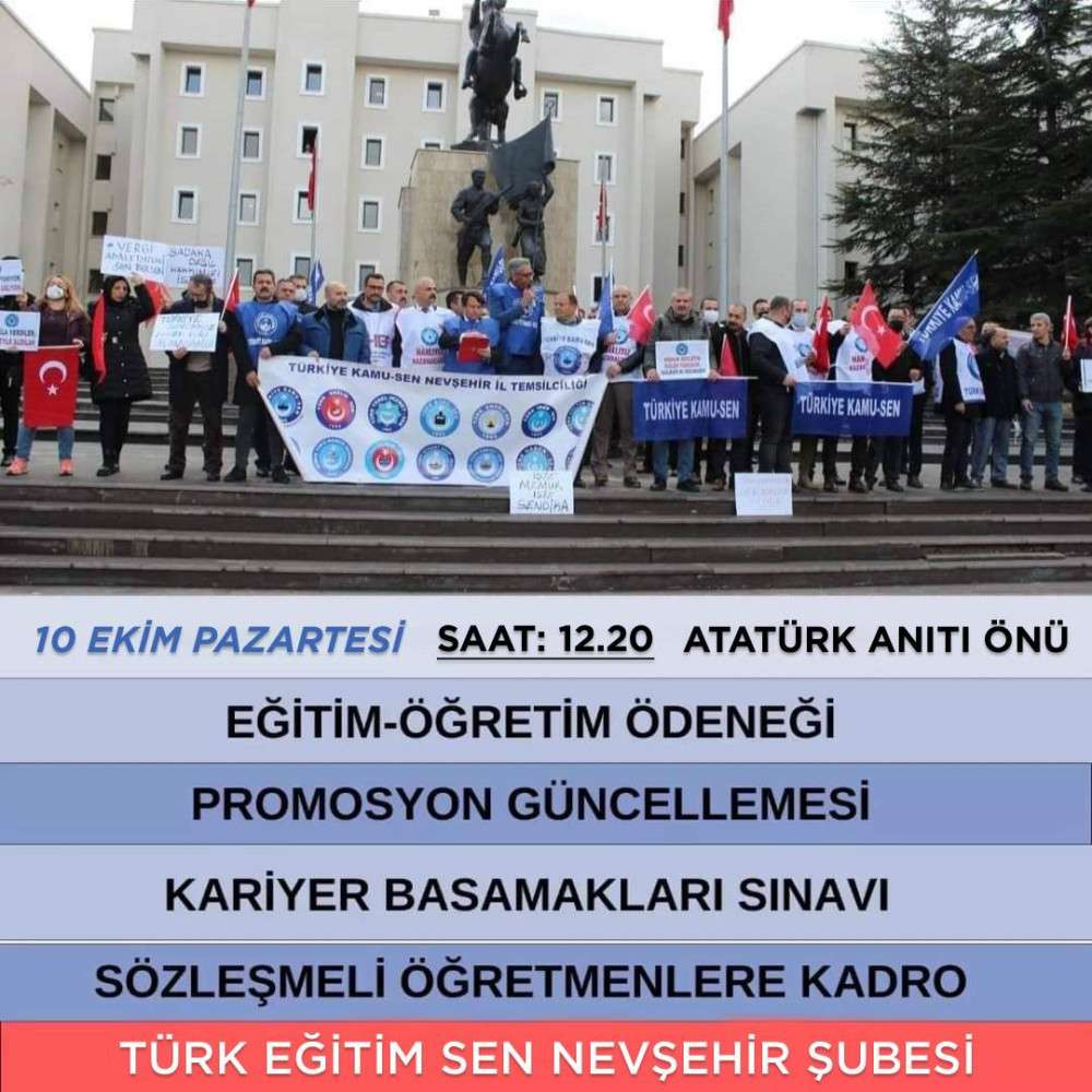 Türk Eğitim-Sen Nevşehir Şubesi 10 Ekim Pazartesi günü saat 12.20’de başta Nevşehir Valiliği Atatürk anıtı olmak üzere tüm ilçelerde aynı saatte ilçe Milli Eğitim Müdürlükleri önünde Eğitim-Öğretim ödeneği, Promosyon güncellenmesi, sözde Kariyer Basamakları Sınavı, Sözleşmeli Öğretmenlere kadro , Milli Eğitim çalışanlarının sorunları , Üniversite’de çalışan akademik ve idari personelin sorunlarını içeren kitlesel basın açıklaması yapacak.