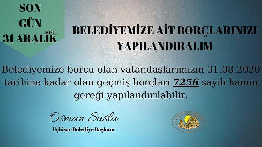 Uçhisar Belediye Başkanı Osman Süslü, !Belediyemize borcu bulunan vatandaşlarımızın 31.08.2020 tarihine kadar olan geçmiş borçları 7256 sayılı kanun gereğince yapılandırabilir" dedi.