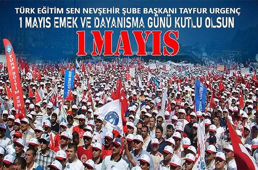 Türk Eğitim-Sen Nevşehir Şube Başkanı Tayfur Urgenç, 1 Mayıs Emek ve Dayanışma Günü’nü kutladı. 1 Mayıs Emek ve Dayanışma Günü’nün mücadelenin, sendikal örgütlenmenin ve emeğin gücü anlamına geldiğini söyleyen Urgenç, “Çalışma hayatının türlü zorluklarına rağmen canını dişine takarak çalışan, ekmek parasını alnının teri ile kazanan, hakları için mücadeleden asla vazgeçmeyen tüm çalışanlarımızın 1 Mayıs Emek ve Dayanışma Günü kutlu olsun” dedi.