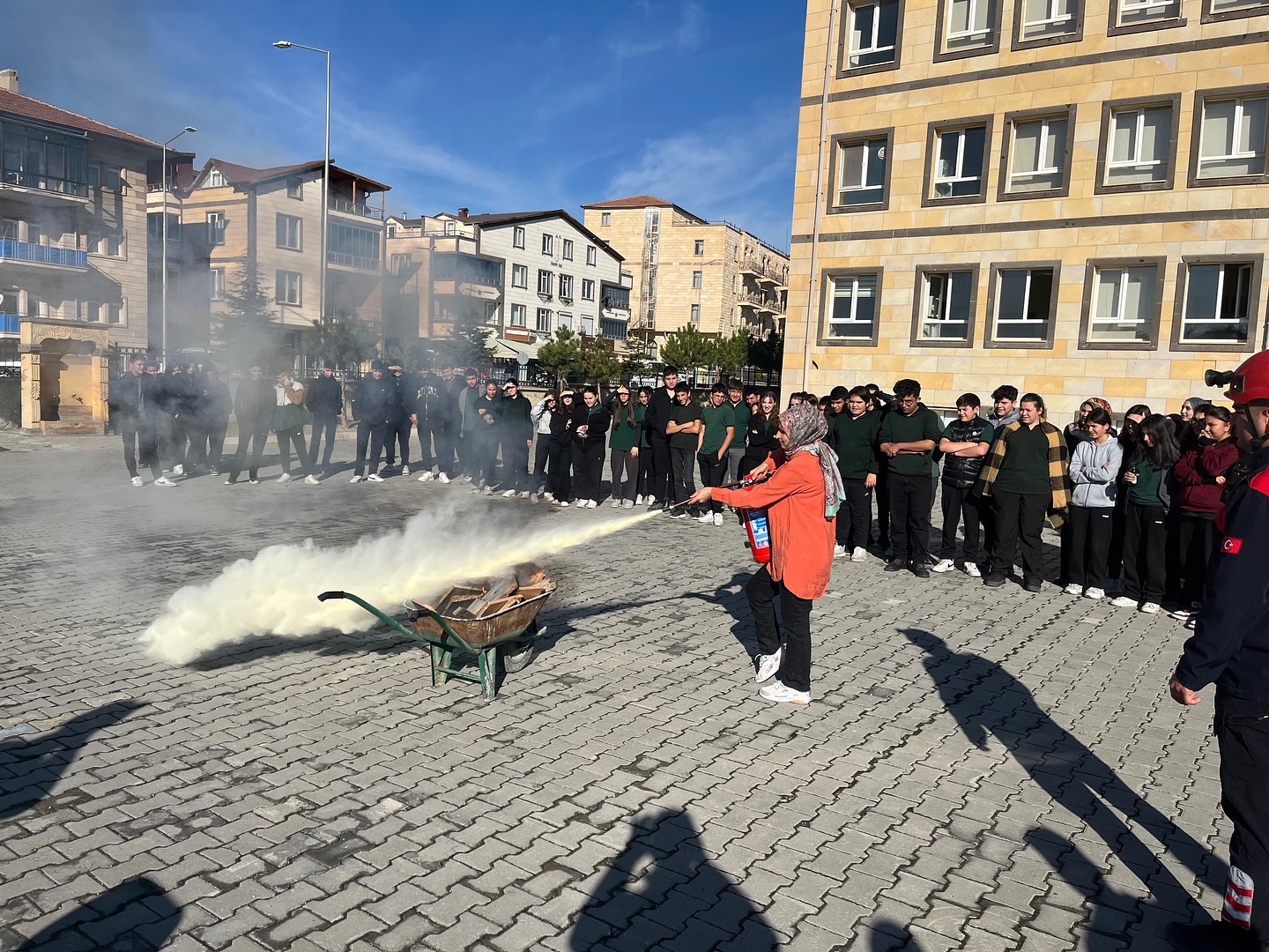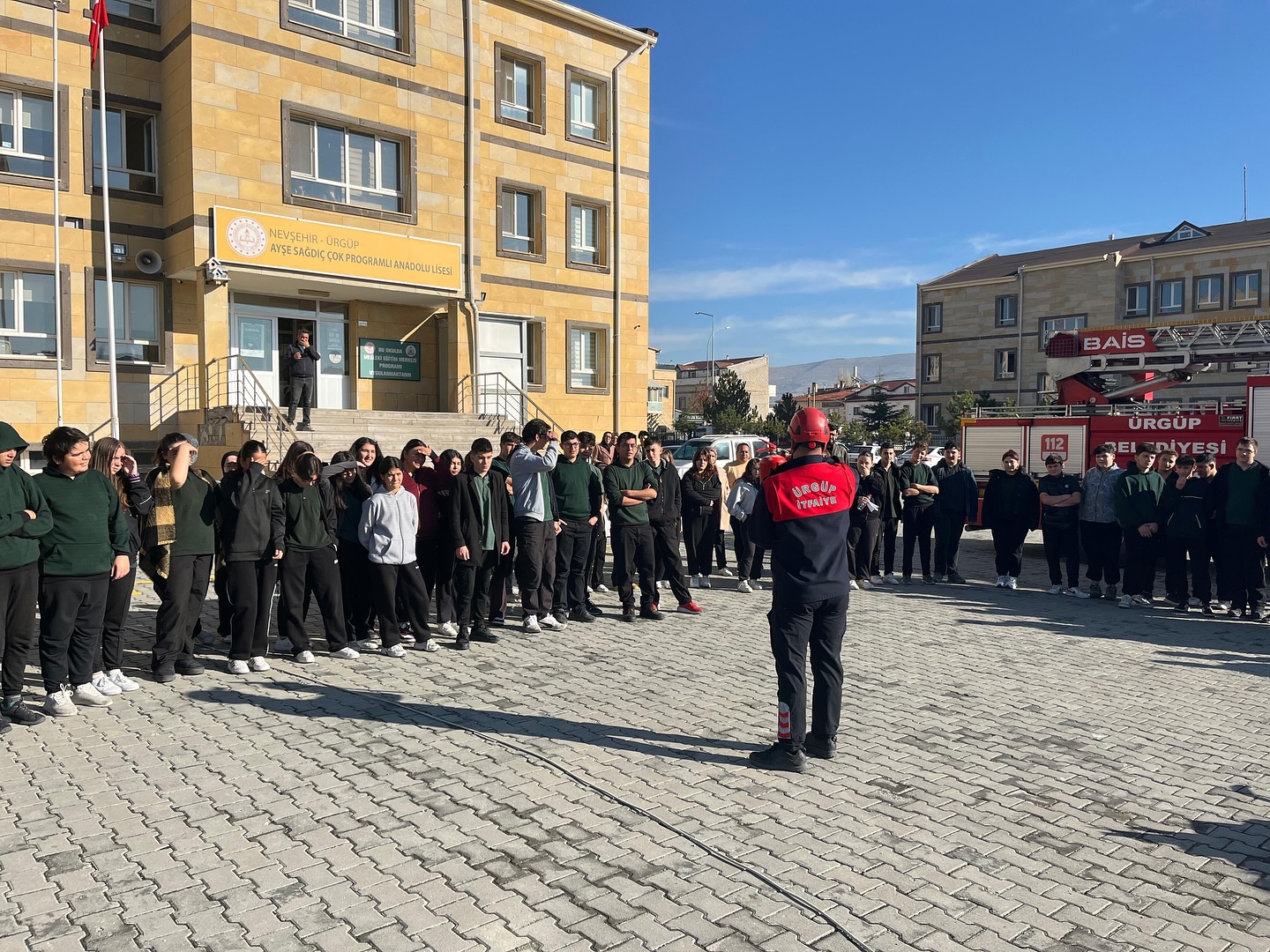 Ürgüp Belediyesi itfaiye ekiplerince Ayşe Sağdıç Çok Programlı Lisesi’nde öğrencilere yangın ile mücadele eğitimi verdi.