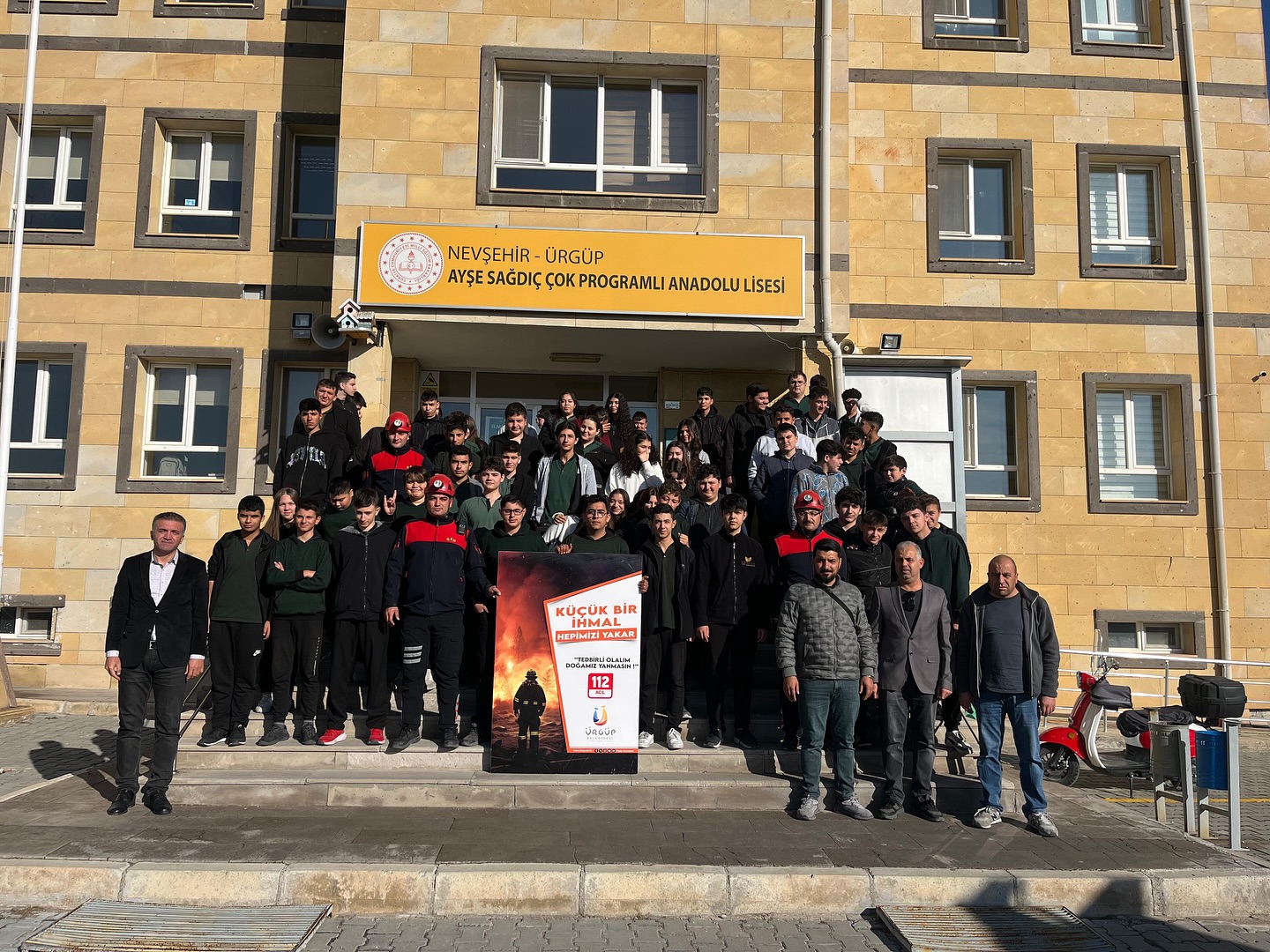 Ürgüp Belediyesi itfaiye ekiplerine Ürgüp Ayşe Sağdıç Çok Programlı Lisesi’nde öğrencilere yangın eğitimi verildi. İtfaiye personelleri tarafından herhangi bir yangınla karşılaşıldığı zaman yangın tüpünün nasıl doğru kullanılacağı konusunda bilgilendirme yapılmasının ardından yangın söndürme tatbikatı yapıldı.