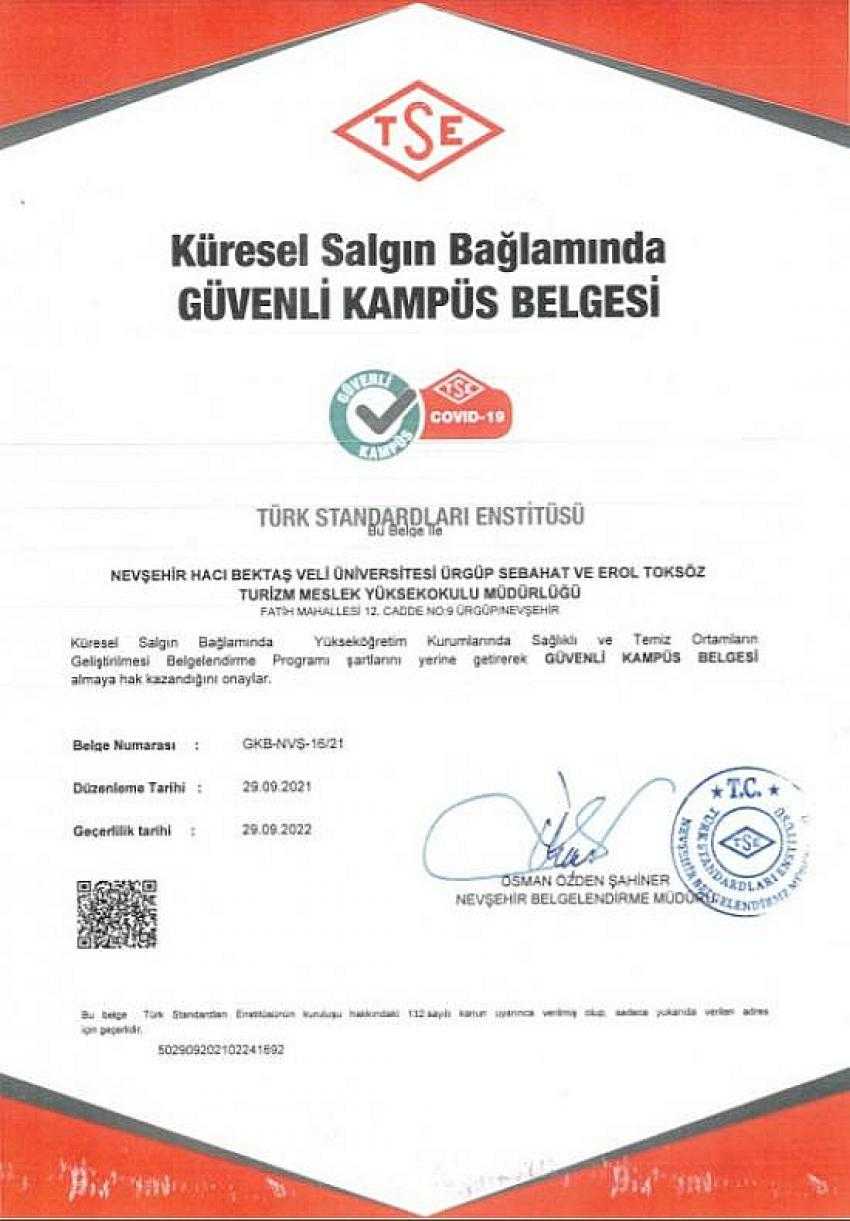 Nevşehir Hacı Bektaş Veli Üniversitesi Ürgüp Sebahat ve Erol Toksöz Turizm MYO, Yükseköğretim Kurulu (YÖK) ve Türk Standartları Enstitüsü (TSE) iş birliğinde hazırlanan 'Sağlıklı ve Güvenli Kampüs Belgesi'ni almaya hak kazandı.