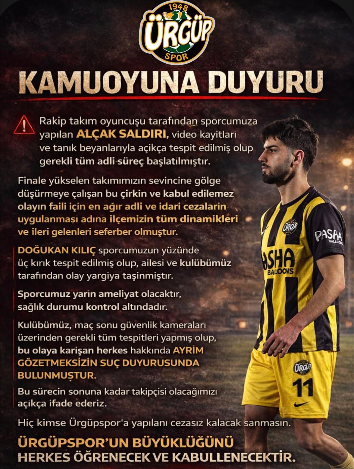 Açıklamada, söz konusu saldırının video kayıtları ve tanık beyanlarıyla açık bir şekilde tespit edildiği belirtilerek, olayın failleri hakkında en ağır adli ve idari cezaların uygulanması için girişimlerin sürdüğü ifade edildi. Ürgüpspor yönetimi, finale yükselen takımın sevincine gölge düşürmeye çalışan bu çirkin olayın kabul edilemez olduğunu vurguladı.