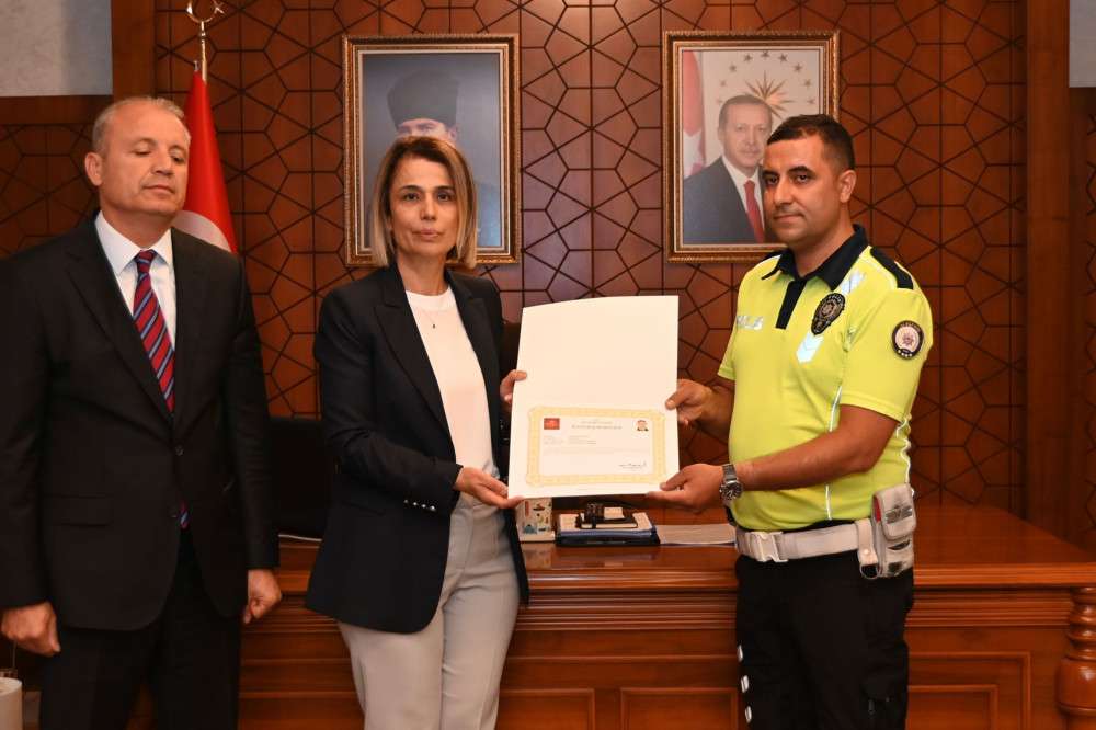 Nevşehir’de sınav tedbirleri kapsamında sınav çıkışı bir öğrenciyi hafriyat kamyonunu altında kalmasını dikkati sayesinde kurtaran polis memurunu Nevşehir Valisi İnci Sezer Becel üstün başarı belgesi vererek ödüllendirdi.