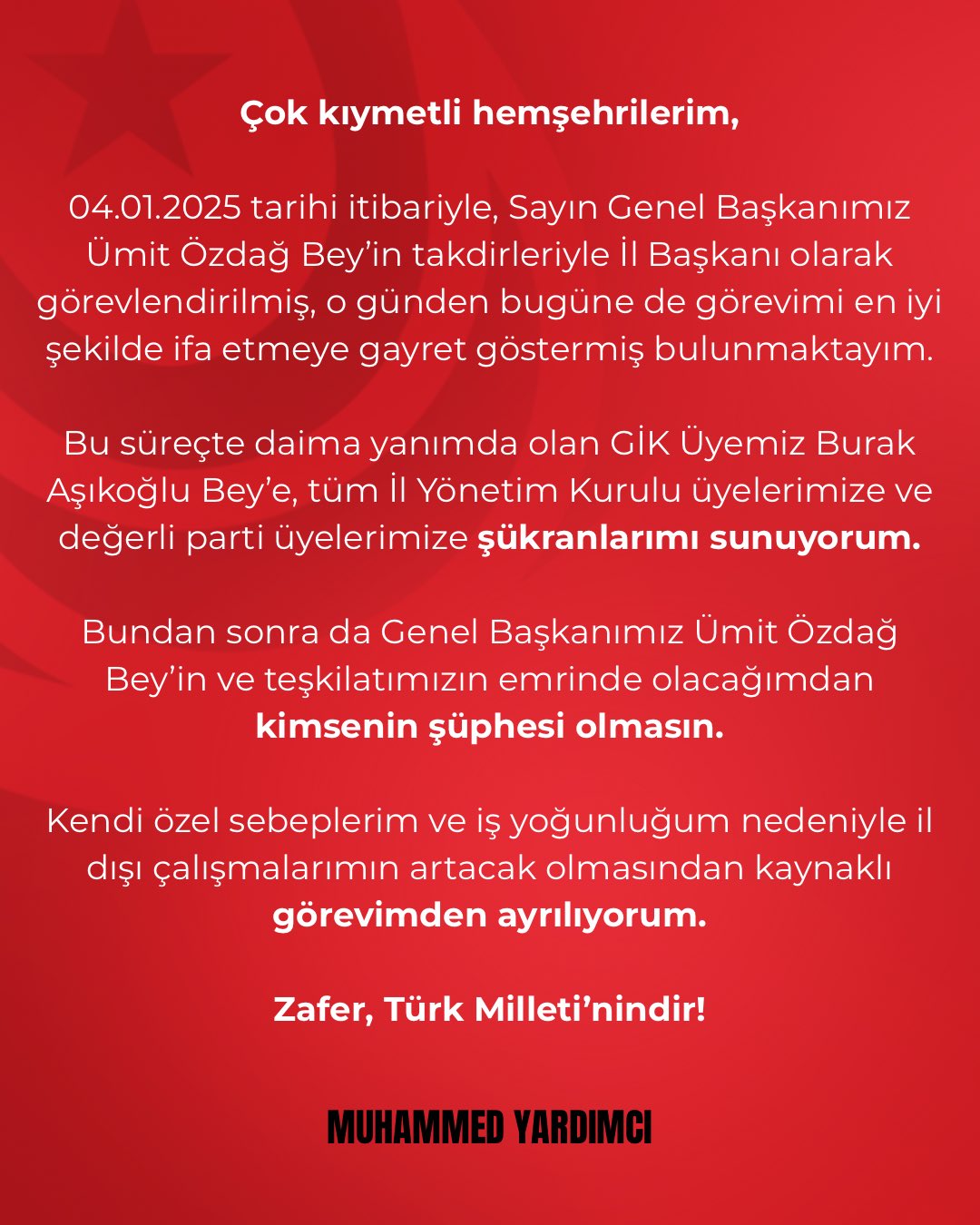 Zafer Partisi İl Başkanı Muhammed Yardımcı, yaptığı yazılı açıklamayla görevinden ayrıldığını kamuoyuna duyurdu. Yardımcı, 4 Ocak 2025 tarihinden itibaren Zafer Partisi Genel Başkanı Ümit Özdağ’ın takdiriyle İl Başkanı olarak görevlendirildiğini ve bugüne kadar görevini en iyi şekilde yerine getirmeye gayret ettiğini belirtti.