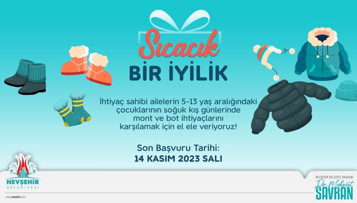 Eğitime destek projelerinin yanında ihtiyaç sahibi aileler için yaptığı kampanyalar ile sosyal belediyeciliğin en güzel örneklerini sergileyen Nevşehir Belediyesi, ‘Sıcacık Bir İyilik’ sloganıyla ihtiyaç sahibi aileler için yeni bir kampanya başlattı. Kampanya çerçevesinde; ihtiyaç sahibi dar gelirli ailelerin 5-13 yaş grubundaki çocuklarının kışlık mont ve bot ihtiyaçları hayırseverlerin de desteği ile Nevşehir Belediyesi tarafından karşılanacak. Kampanyaya başvurular 14 Kasım 2023 Salı günü akşam saat 17.00’a kadar Nevşehir Belediyesi’nin kurumsal web sitesi olan www.nevsehir.bel.tr adresi üzerinden alınacak.